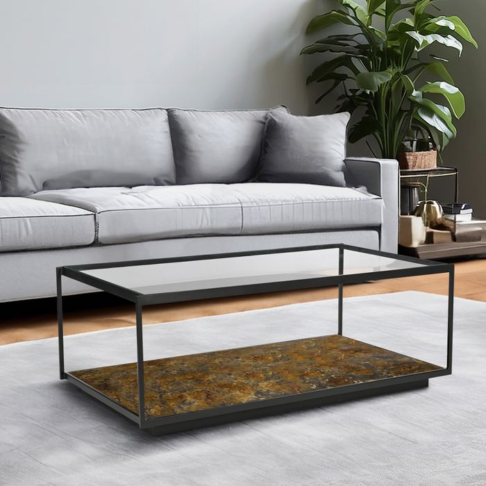 Add a dash of cosmic charm to your space with our Ashton Coffee Table! Crafted from sturdy Iron, the lower tier features a gorgeous ashton finish, complemented by a bold black frame and chic glass top. It's like having a mini-universe tucked away in your living room. And for a coordinated look, pair it with our Galaxy end table.