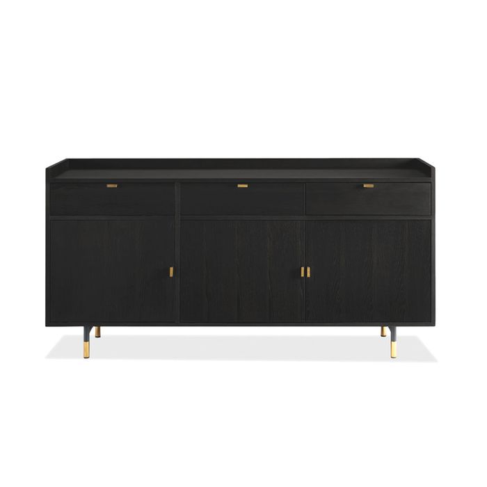 Dark oak veneer cabinet body, black powder coated metal legs with brass foot cap detail.