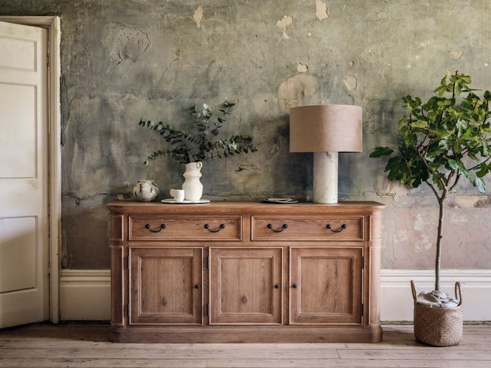 Every piece of furniture is individually crafted by skilled artisans. Oak solids and veneers are carefully selected for their grain character. The rich warm hues of the timber are created by patiently applying multi layers of lacquer by hand and offset by the aged pewter finish of the hardware.