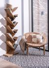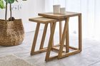 Natural teak benchmade pieces including small tables and contemporary shelving.