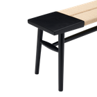 The Elder Bench is a boho-chic piece with a black frame and rattan accents. It offers ample seating and a unique, organic feel to any room. A stylish and functional addition to any living space.