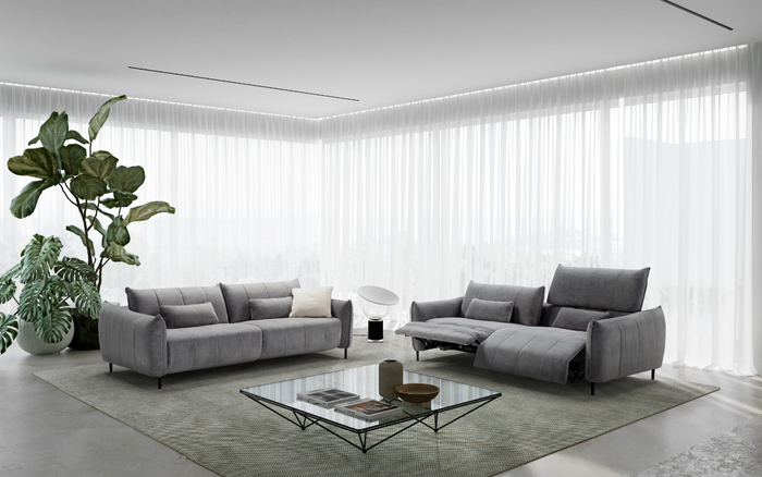 THE REFINED LINE OF THE ARMRESTS AND BACKRESTS AS WELL AS THE DESIGN OF THE STITCHING ENHANCE ITS SHAPES WHILE THE METAL LEGS ELEGANTLY SUPPORT THE SOFT CUSHIONS.