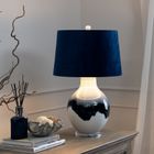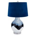 This is the Ice Shadows Table Lamp With Navy Blue Lampshade. This stylish Glass lamp with unique blue and white glaze comes complete with the premium quality ball-topped navy velvet shade, pictured. Each lamp's hand-dipped glaze will be truly unique, making each one all the more special. Brighten up any room with its handcrafted beauty and layer additional texture into a space. E27 Screw Bulb required.