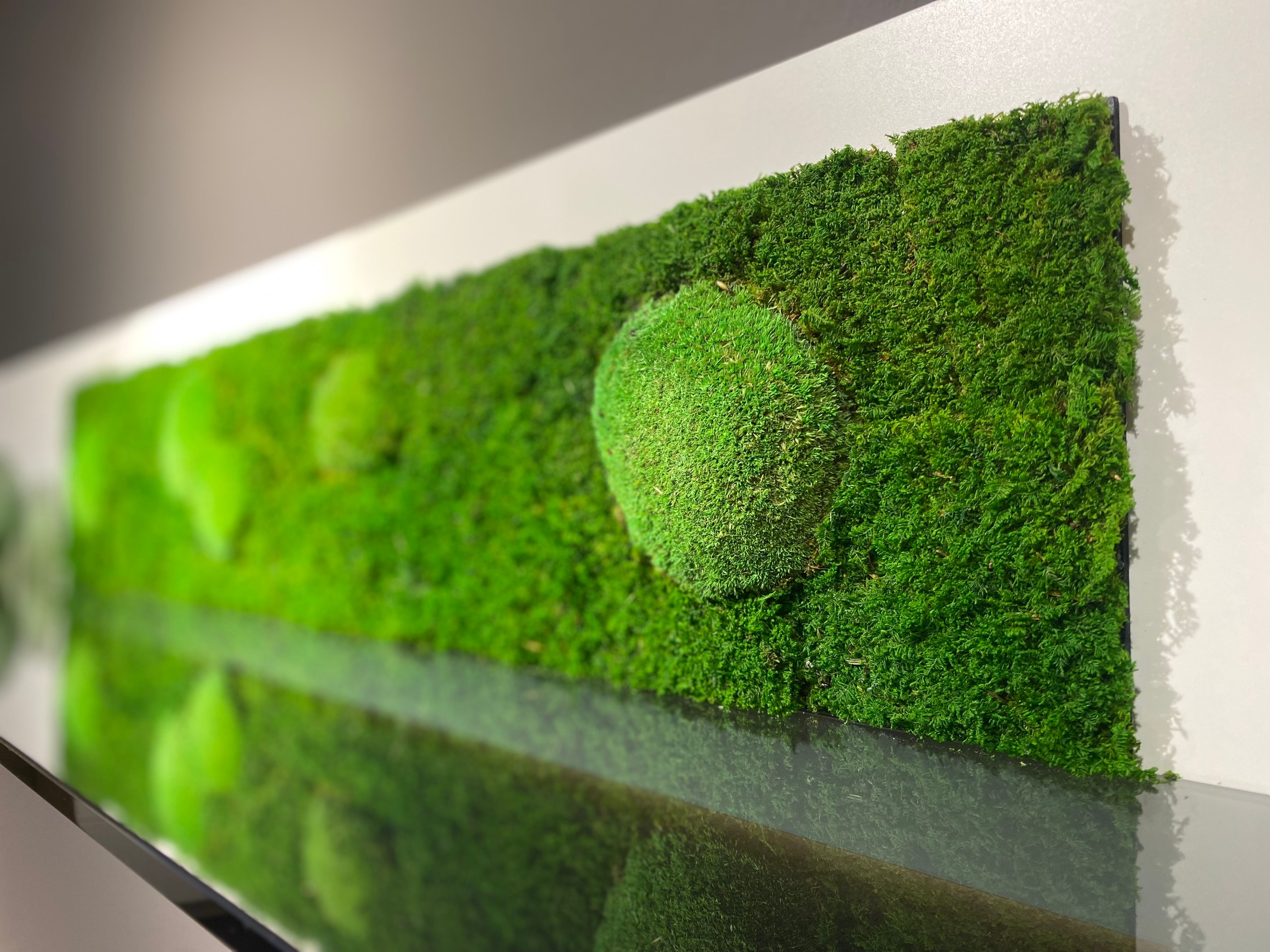 LINERA convinces with an elegant, simple design, with a discreet handle strip and a high-quality processed slat in the precious veneers wild oak and natural walnut. Combined with the lacquer colours anthracite, fango and white, a natural modernity is conveyed. As an absolute novelty on the furniture market, GWINNER presented an unprecedented combination of exclusive furniture pieces, unique moss designs and a sustainable quality for a truly green home by cleverly complementing LINERA with moss panels.