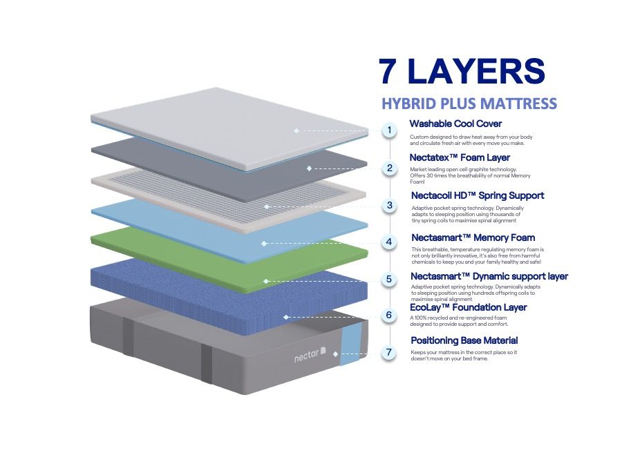 Designed with a slightly firmer feel, the mattress offers excellent spinal support whilst still allowing the adaptive Nectacoil™ technology to dynamically conform to your body as you change sleeping positions through the night. Free from nasty chemicals, with the breathability you would expect from a Nectar mattress, the Nectar Hybrid Plus is the market leading firmer feel hybrid mattress.