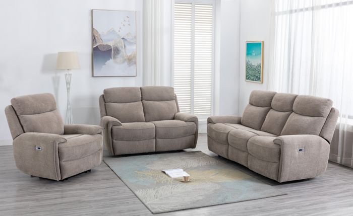 Our new Sofia power recliner sofa group in oatmeal fabric will be available for delivery in February 2023
