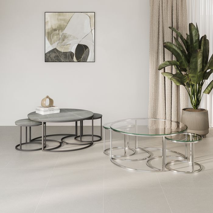The Orlando Coffee Set offers a contemporary and versatile solution with its nest of tables design. Available in 2 different materials option: polished stainless steel with glass or matte grey sintered ceramic tabletops with grey metal frame. The set, consisting of three tables, provides flexibility in use and adds a stylish touch to your living space.