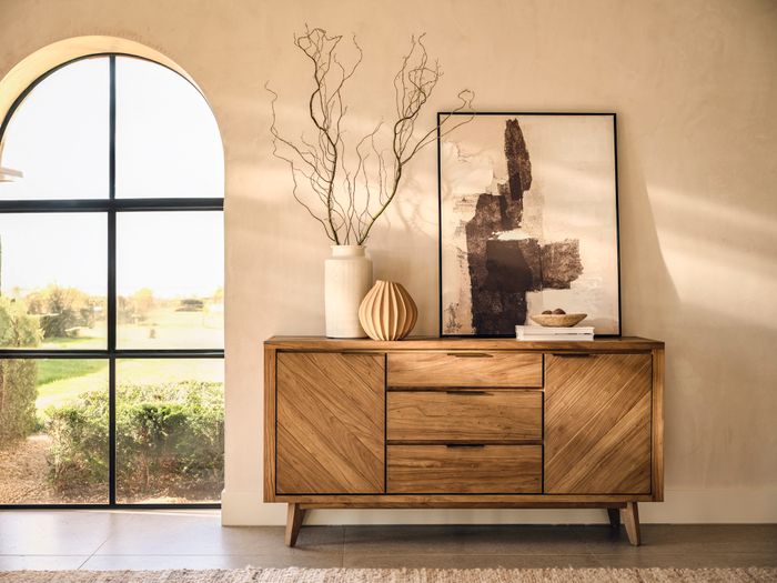 Add the wide sideboard with chevron doors or the tall open display for contemporary, stylish storage to complete the look.