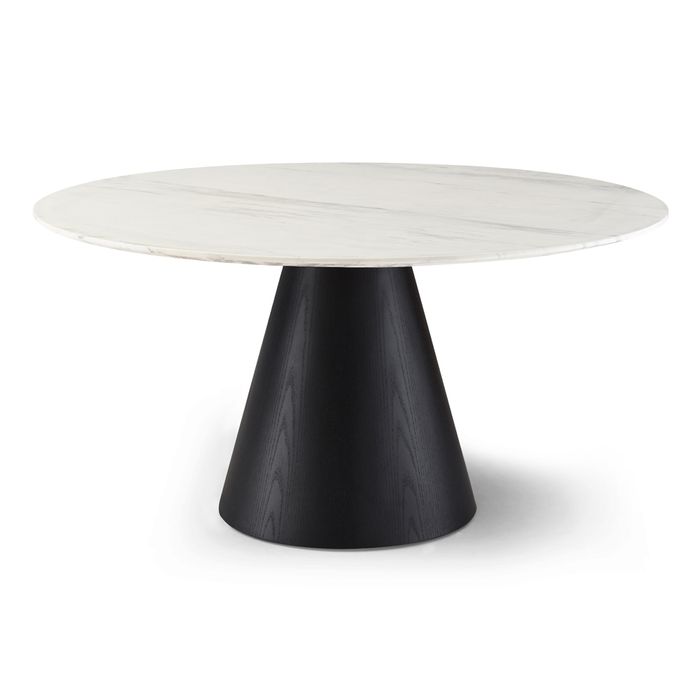 Imported, white Carrara marble top in matte finish, black oak veneer base.