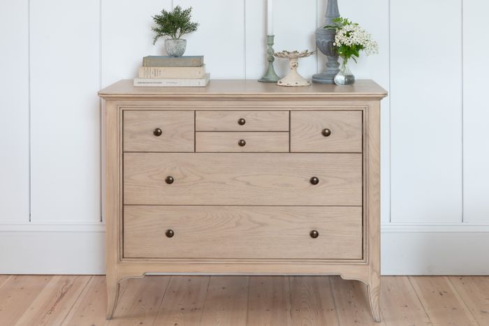 Carefully selected for their alluring grain character the oak solids and veneers are hand finished with white hue laquer. Authentically aged brass handles complete the aspirational curated look.