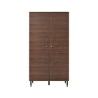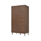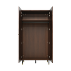 The Willow Wardrobe has a beautiful tobacco walnut veneer finish and an elegant, opulent aesthetic. It has a top shelf and a core section with a hanging rail, all enclosed with two doors and brass circular handles, perfect for storage and luxury spaces.
