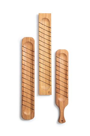The baguette should be long and skinny, with a crisp crust, a nice brown exterior color, and a moist, cream-colored crumb with an irregular structure. The La Baguette cutting and serving board enhance